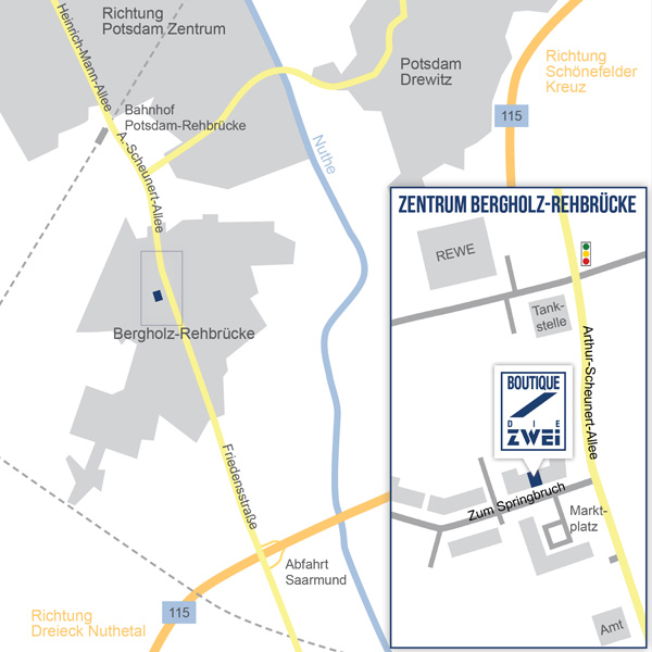 Unser Geschäft befindet sich im Ortszentrum von Bergholz-Rehbrücke. Sie biegen am Marktplatz in die Ladenstraße ein und folgen dieser etwa 50 Meter. Die Boutique Die Zwei befindet sich auf der rechten Straßenseite. Zahlreiche kostenlose Parkplätze gibt es in unmittelbarer Nähe.
